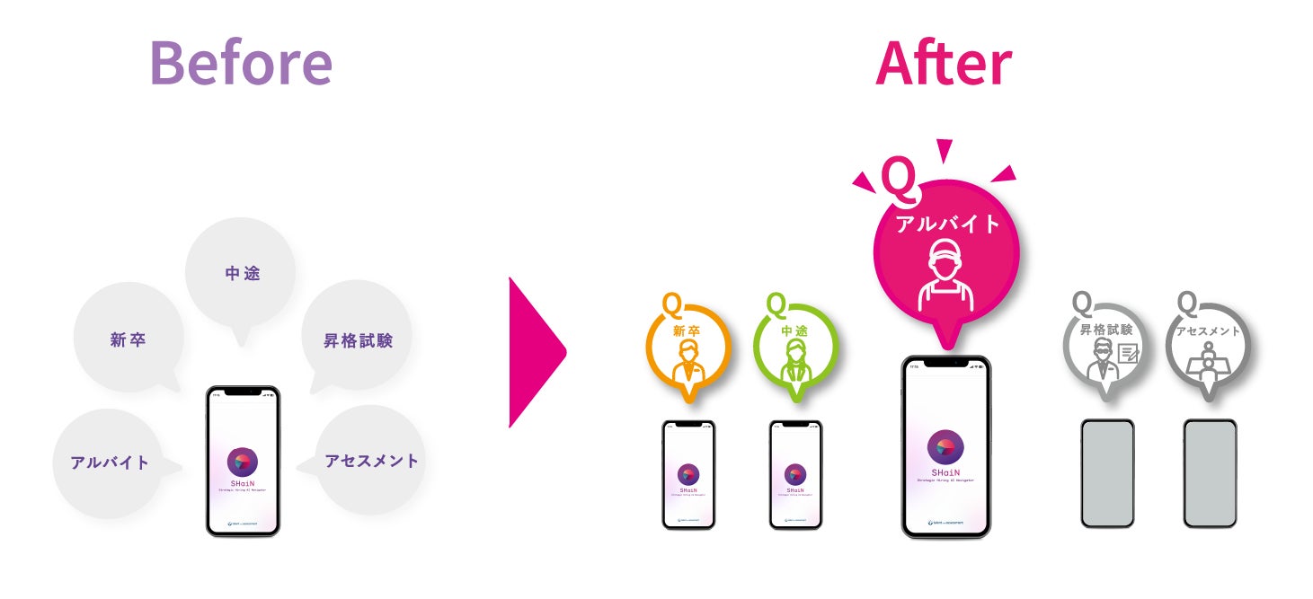 近年、アルバイト採用においてSHaiNの導入が急速に普及しています。この時代背景を受け、より高度な受検体験を提供するために、受検者が違和感なく対話することを可能にしたアルバイト向けバージョンの提供を開始します。根幹となる戦略採用メソッドや評価の精度を維持し、アルバイト応募者に多い若年層がスムーズに対話できるように質問を変更しました。