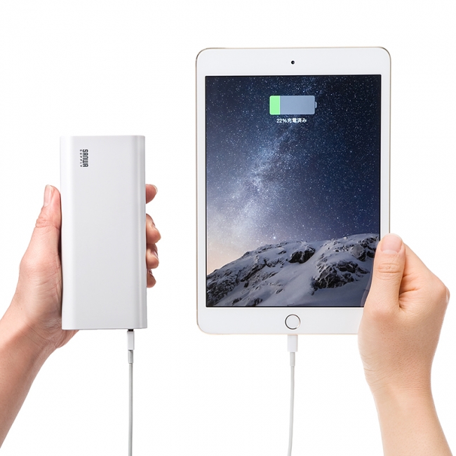 13000mAhの大容量バッテリー搭載で、例えばiPhone 6であれば満充電で約4回分、iPad Air 2であれば約1回分の充電が可能です。外出中はスマホの充電切れが気になりがちですが、繰り返し充電可能なので安心です。機器への充電には、接続機器を自動認識して最適な出力値で充電を行えるモードを搭載しています。iPhone 6 PlusやXperia Z3などの高出力のスマートフォンに対しても急速充電が可能なので、充電が遅くてイライラすることがありません。