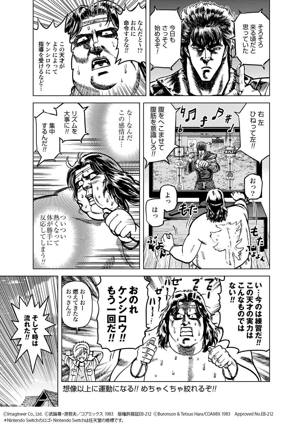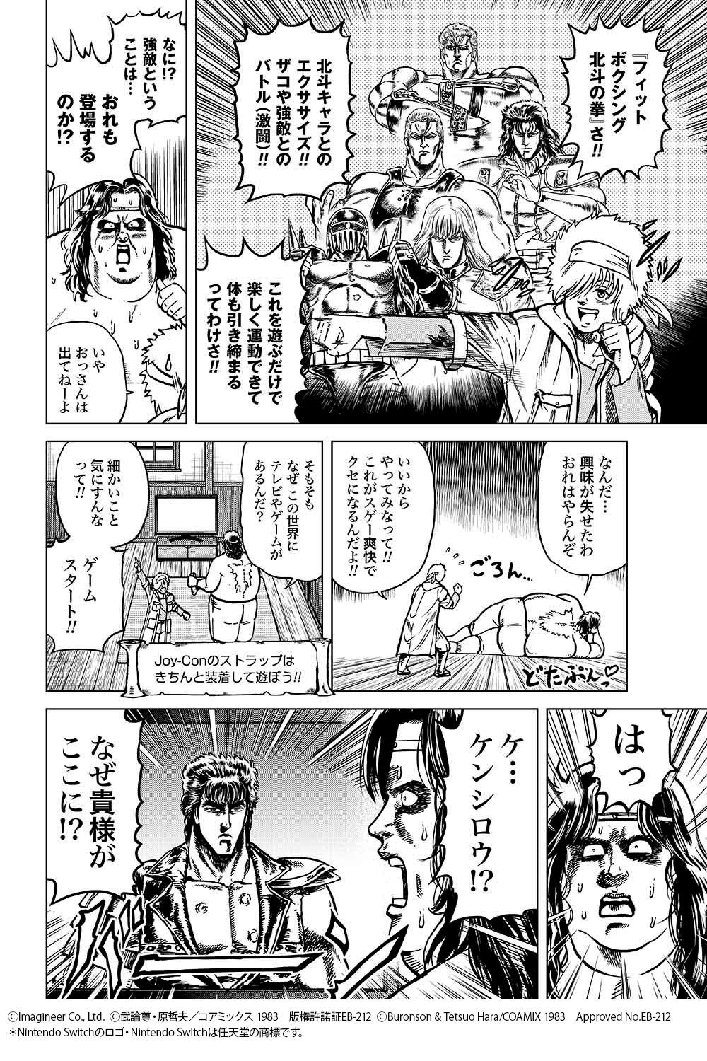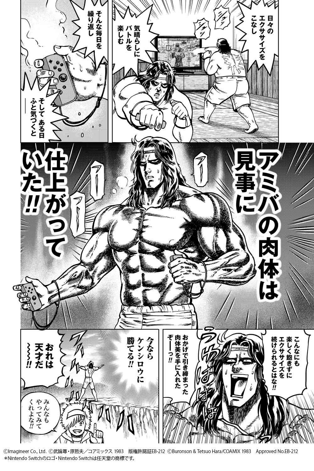 「北斗の拳外伝 天才アミバの異世界覇王伝説」は、月刊コミックゼノンで現在大人気連載中の「北斗の拳」スピンオフ作品ですが、「Fit Boxing 北斗の拳」発売となる本日、描き下ろしのコラボレーションマンガを公開します。異世界でぽっちゃりしてしまったアミバが「Fit Boxing 北斗の拳」でどう変わるのか!?全編は「Fit Boxing 北斗の拳」公式サイトよりご覧下さい。