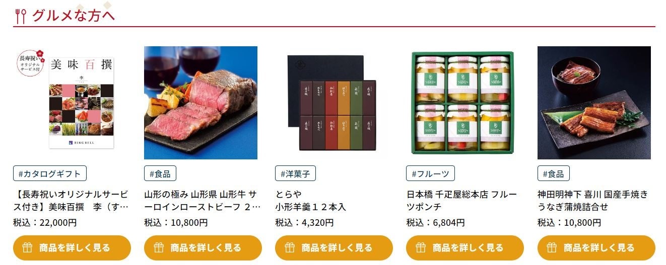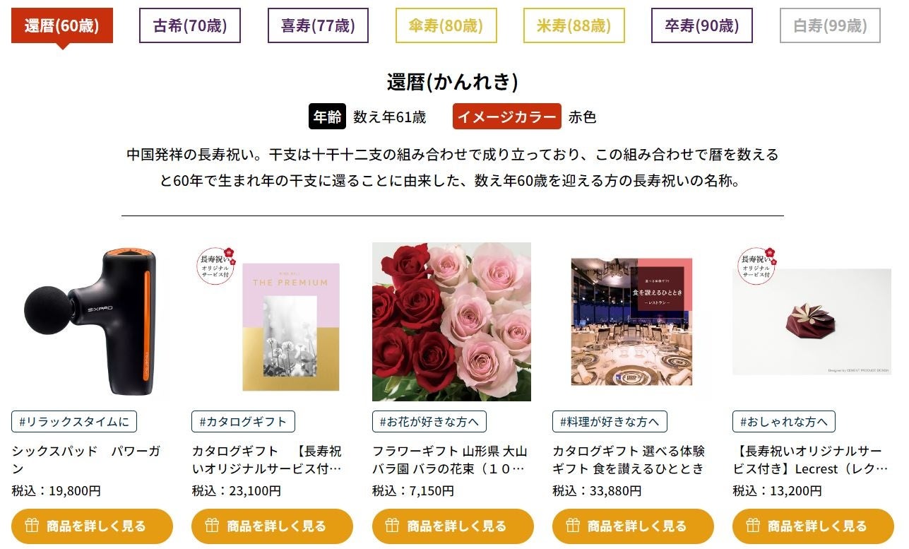 専用ページでは、還暦・古希・喜寿・傘寿・米寿・卒寿・白寿といったイベントそれぞれのお祝いに最適な商品 をお選びいただけるほか、「おしゃれな方へ」「お花が好きな方へ」「グルメな方へ」「晩酌が好きな方へ」といった贈る相手の好みを考えながらギフトをお選びいただけます。
