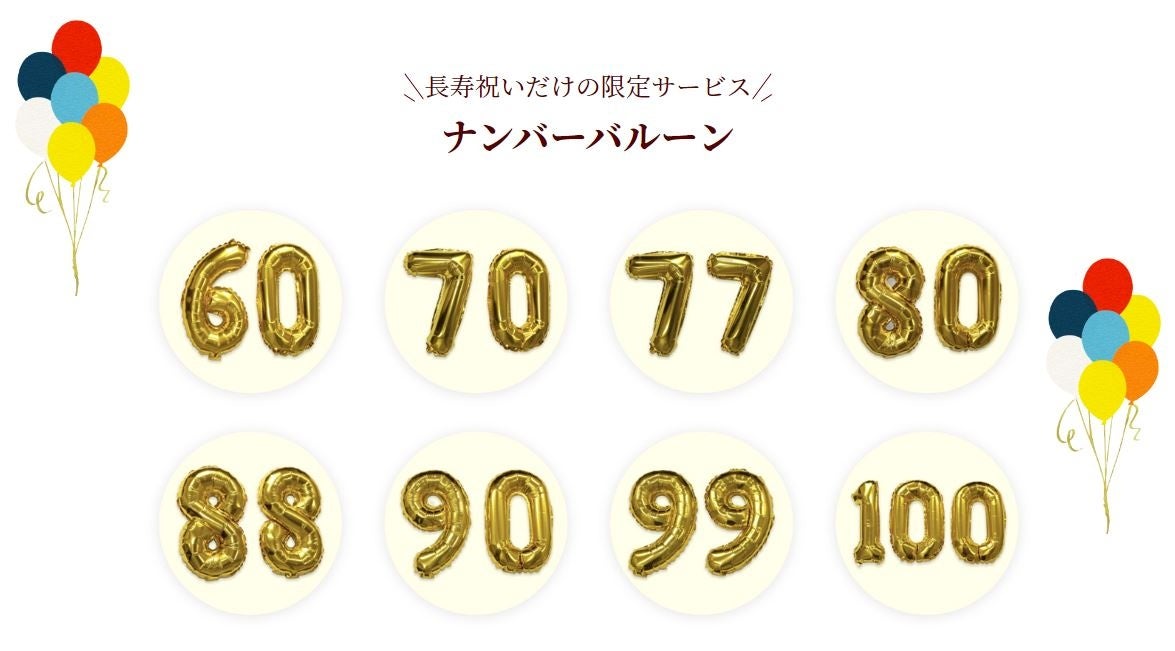 ギフト商品として、カタログギフトをはじめとした長寿祝いのプレゼントにおすすめのアイテムを多数ラインナップ。さらに、お祝いを彩る「ナンバーバルーン」や「鶴のアート水引」、オリジナルメッセージカードなど、『贈って楽しい。もらってうれしい。』にこだわったサービスも用意しています。