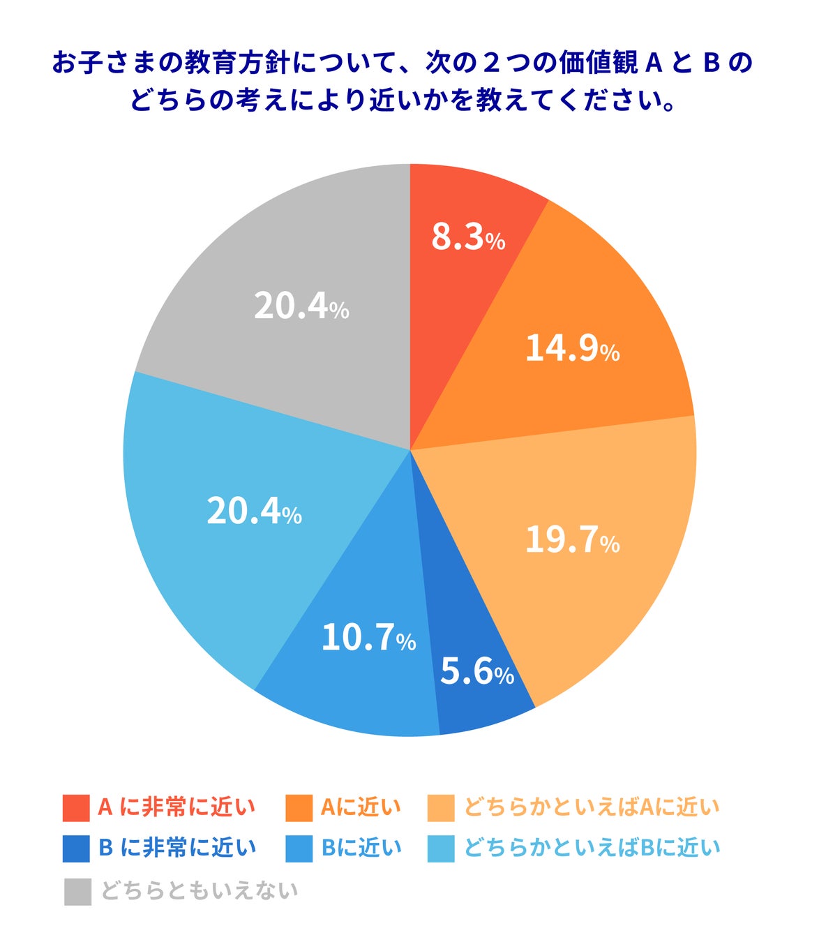 保護者に対し、「(A)みんなができることをしっかり身につけさせたい」「(B)うちの子の得意・個性を伸ばしたい」という教育方針のうち、どちらをより重視しているかを質問したところ、以下の結果が得られました。