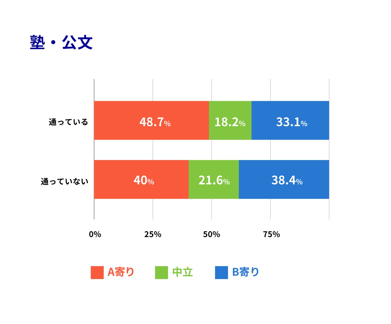 学習塾を選ぶご家庭では、「みんなができることをしっかり身につけさせたい」(A寄り)の傾向が強い結果となりました。