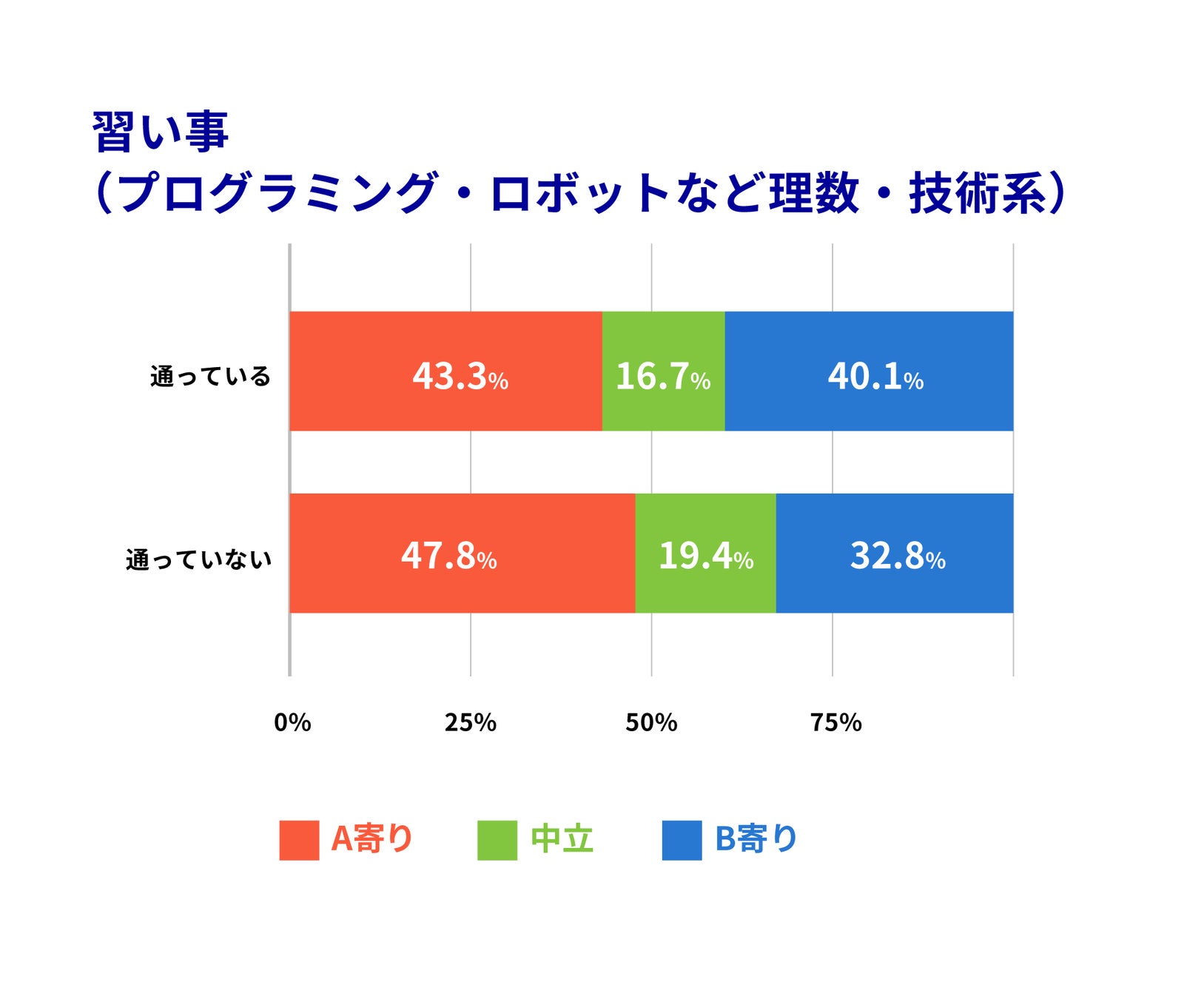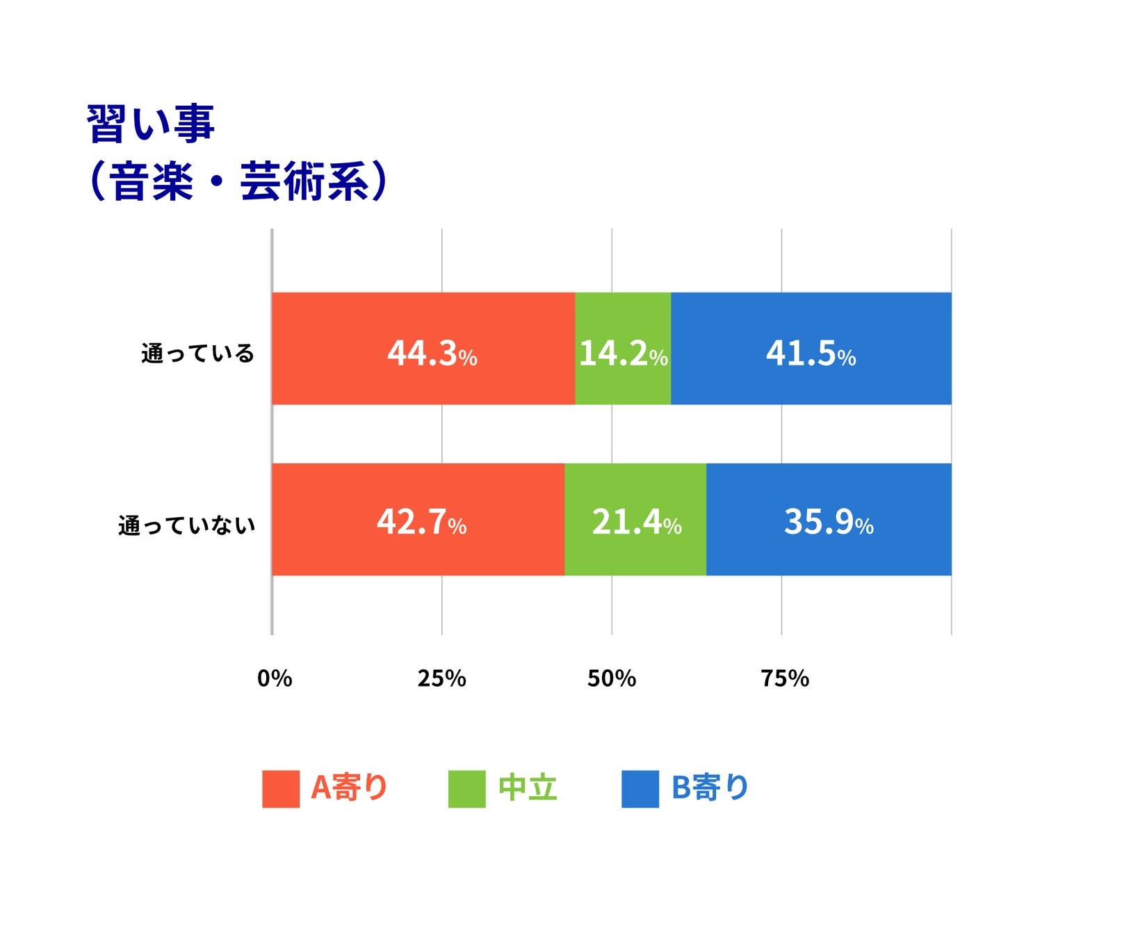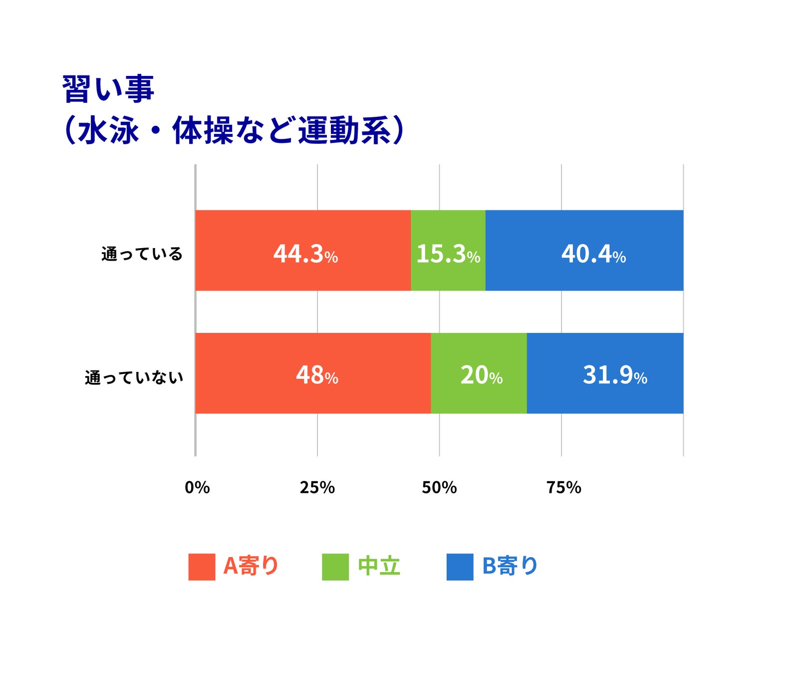 この分野の習い事を選ぶご家庭では、「うちの子の得意・らしさを伸ばしたい」(B寄り)の傾向がやや高い結果となりました。