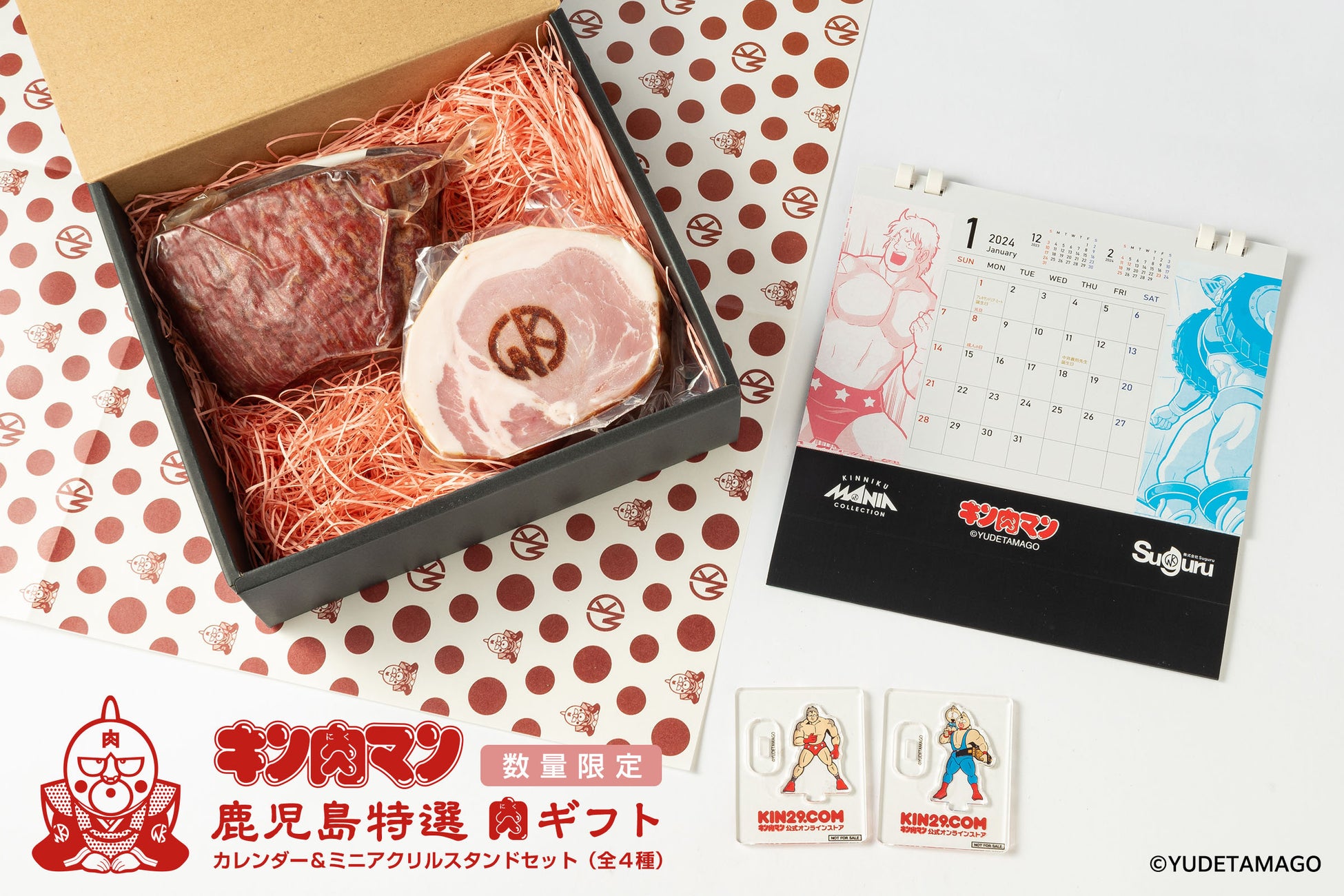今回、セットとして「キン肉マン卓上カレンダー」のほか、鹿児島県産の「黒牛」と「黒豚」の強力タッグにあわせて、キン肉マンに登場する超人タッグの「ミニアクリルスタンド」1組を付属しています。