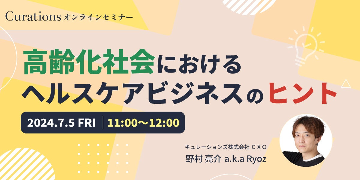 顧客企業のビジネス変革を成功に導くキュレーションズ株式会社(本社:東京都渋谷区、代表取締役社長:根本隆之、以下当社)は、『高齢者市場向けヘルスケアビジネスの現在地と未来とは?』を2024年7月5日(金)に開催いたします
