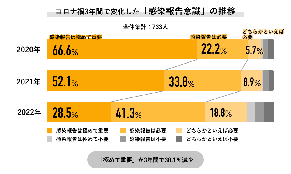 2020年〜2022年の3年間で「感染報告意識」の変化を聞くと、「感染報告は極めて重要」の回答が2020年では66.6%だったのに対して、2021年には52.1%に下がり、2022年は28.5%にまで下がっています。また「報告は極めて重要」と「報告は必要」を合算した回答でも、2020年は88.8%に対して、2021年は85.9%でほぼ横ばいですが、2022年には69.8%と減少する結果になりました。