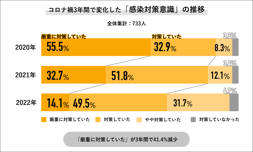 2020年〜2022年の3年間で「感染対策意識」の変化を聞くと、「厳重に対策していた」の回答が2020年では55.5%で半数以上だったのに対して、2021年には32.7%に下がり、2022年は14.1%にまで下がっています。また「厳重に対策していた」と「対策していた」を合算した回答でも、2020年は88.4%に対して、2021年は84.5%で、2022年は63.6%と大きく減少する結果になりました。