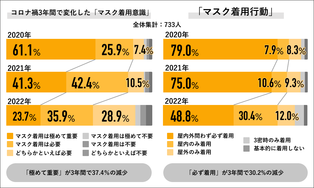 Job総研では733人の社会人男女を対象に、コロナへの危機感、感染対策、マスク着用、感染報告、ワクチン接種、政府のコロナ対策への関心度などさまざまな観点から3年間の意識や行動の変化を調査した「2022年 コロナ禍の行動変化調査」を実施しました。