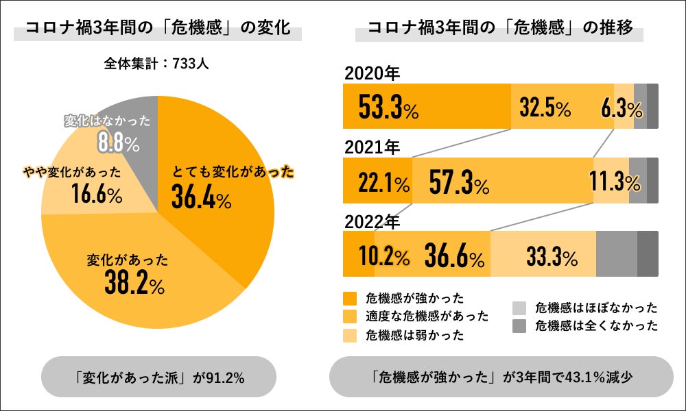 2020年〜2022年の3年間での「危機感」の変化を聞くと、「とても変化があった」36.4%、「変化があった」38.2%、「やや変化があった」16.6%を合算した91.2%が”変化があった派”の回答をしました。