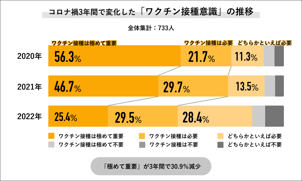 2020年〜2022年の3年間で「ワクチン接種意識」の変化を聞くと、「接種は極めて重要」の回答が2020年では56.3%で半数以上だったのに対して、2021年には46.7%に下がり、2022年は25.4%にまで下がっています。また「接種は極めて重要」と「接種は必要」を合算した回答でも、2020年は78.0%に対して、2021年は76.4%とほぼ横ばいですが、2022年は54.9%と大きく減少する結果になりました。