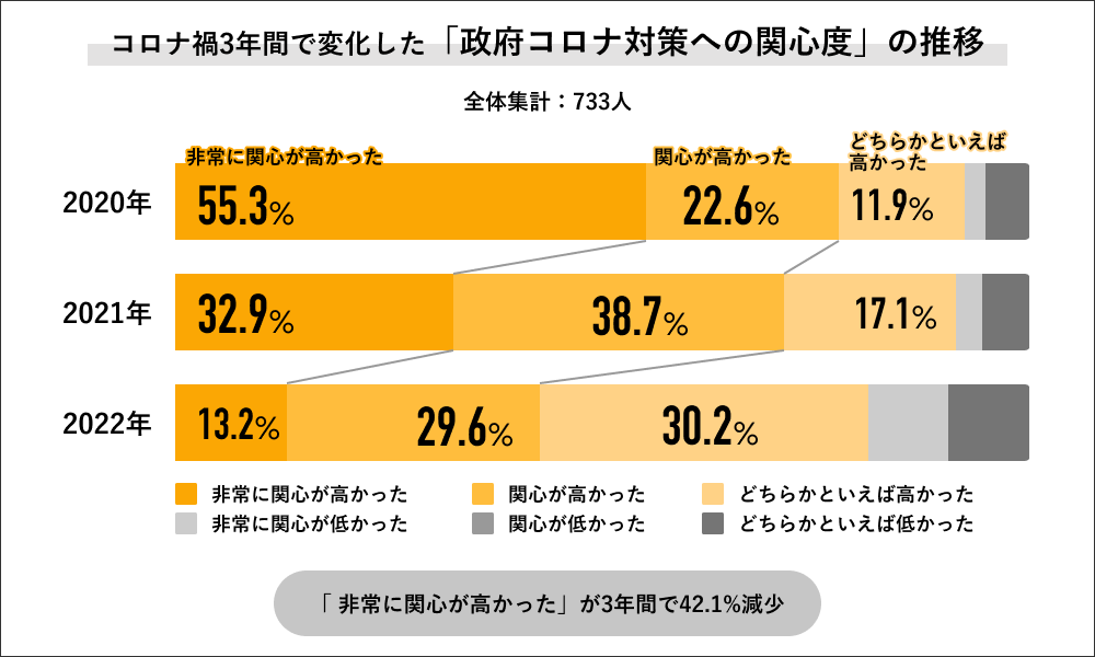 2020年〜2022年の3年間で「政府コロナ対策への関心度」の変化を聞くと、「非常に高かった」の回答が2020年では55.3%と半数以上だったのに対して、2021年には32.9%に下がり、2022年は13.2%にまで下がっています。また「非常に高かった」と「高かった」を合算した回答でも、2020年は77.9%に対して、2021年は71.6%と微減し、2022年は42.8%と大きく減少する結果になりました。