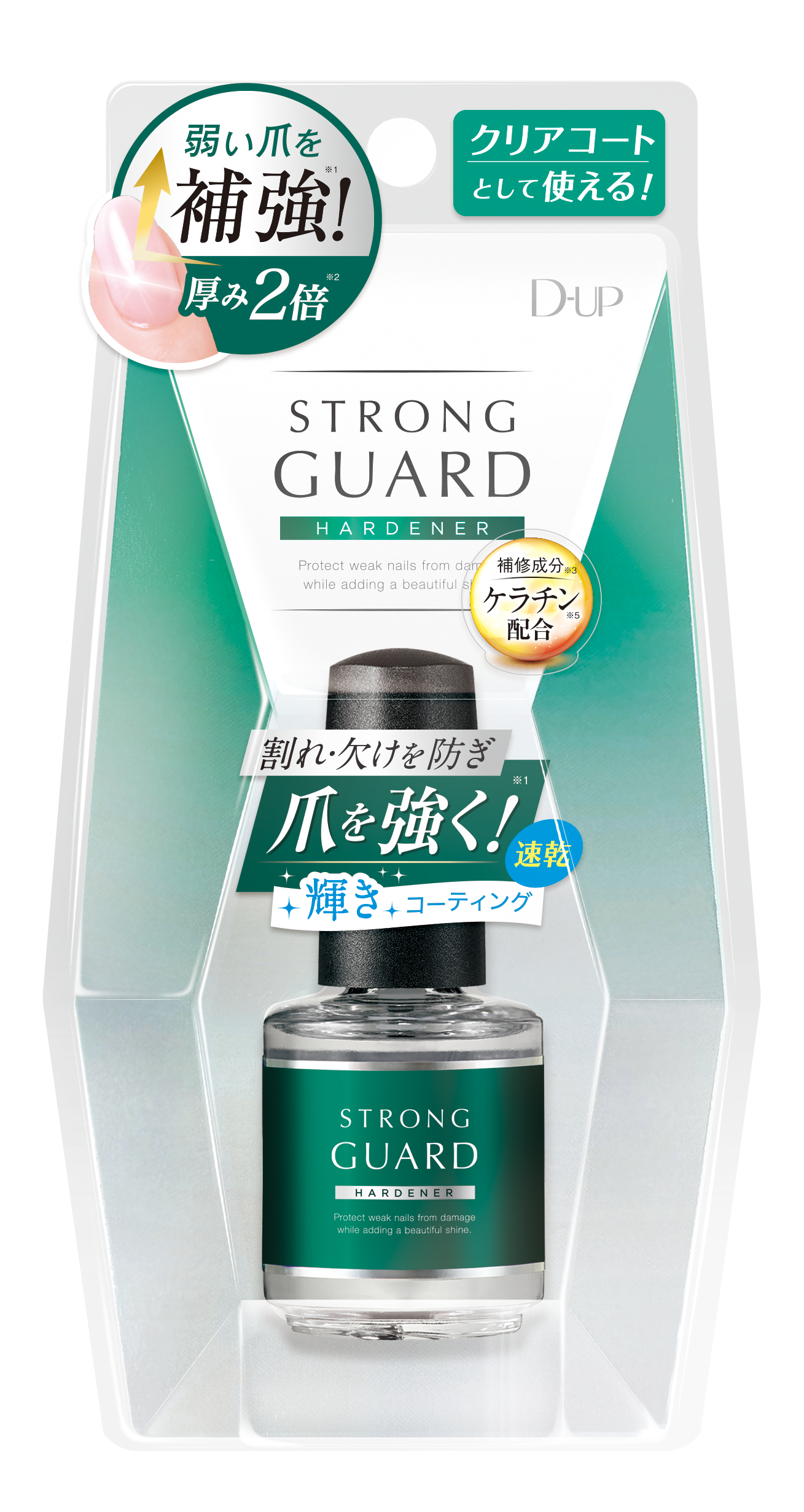 『ストロングガード』は、爪が弱く日常生活のちょっとした衝撃で割れ・欠けが起きてしまいがちな人や、乾燥による二枚爪、ジェルネイルによるダメージで爪が薄くなってしまった人など、様々な爪悩みを抱える方のためのネイルハードナー(爪の強化剤)です。皮膜成分を2倍*配合した“厚膜コーティング層”が、薄く弱い爪にしっかりと厚みをプラスし、爪を強化**。日常生活の様々な衝撃から強力にガードし、4種の有用成分が、割れ・欠けの無い、美しく健やかな爪への成長をサポートします。