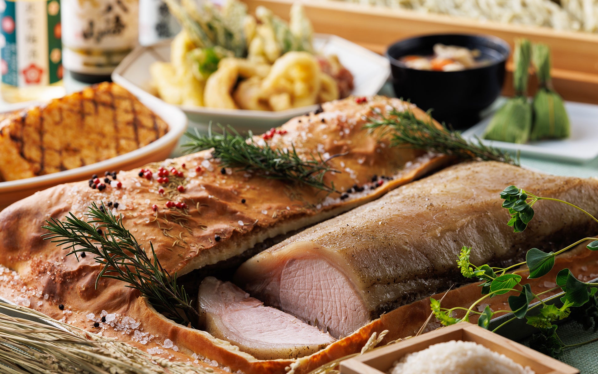 シェフの逸品料理“新潟県産豚ロース肉の塩パイ包み焼きプロヴァンス風”・“新之助のミルクリームスイーツ”や、郷土料理・ご当地グルメ料理、新潟名物“笹団子”などをご用意しています。