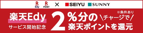 このたびのサービス開始を記念して、4月5日(火)から4月25日(月)まで、「西友」「リヴィン」「サニー」でチャージされた方に(注2)、期間中のチャージ金額の2%分を「楽天ポイント」で進呈(注3)いたします。また、4月26日(火)から5月8日(日)まで、「西友」「リヴィン」「サニー」でお買い物の際「楽天Edy」で支払うと、進呈される「楽天ポイント」が通常の2倍となるキャンペーンも実施いたします。5月9日(月)以降も、「楽天Edy」利用者が西友でお得にお買い物ができる施策を継続的に行ってまいります。