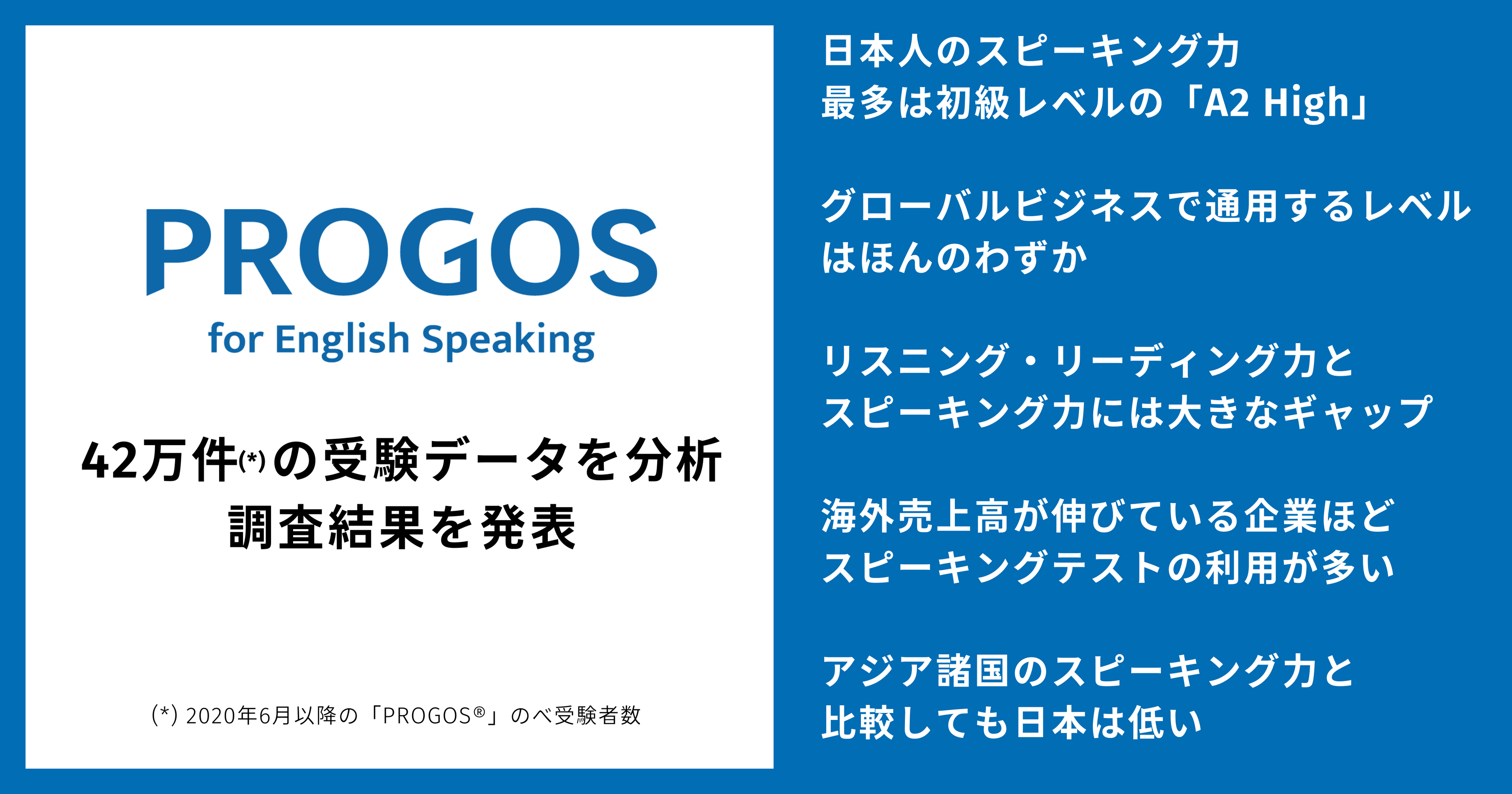 2020年6月、レアジョブグループでは英語スピーキングテスト「PROGOS®」をリリースいたしました。同テストはAIによる自動採点を中心に国内外の企業・大学で広く活用されており、のべ受験者数は42万人に上ります(2023年5月末月時点)。ビジネスにおける実践的な英語スピーキング力の可視化ツールとして、企業の人材育成研修や採用活動、大学における試験など幅広く活用され、定着してまいりました。“日本で最も年間受験者数が多い英語スピーキングテスト”として認知も高まっている中、3年間で蓄積した大規模受験データを調査・分析し、日本人の英語スピーキング力の実態と課題を明らかにいたしました。