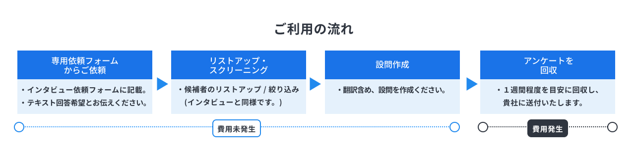 専用依頼フォームからご依頼をいただき、いただいた依頼に基づいて当社にて候補者のリストアップ/絞り込みを行います。その後、設問を作成いただき、1週間程度を目安に回答を回収し送付いたします(設問の送信と回答の回収をクライアント企業に代わり当社が行います)。