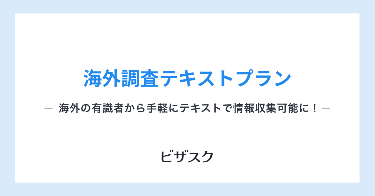 グローバルなナレッジプラットフォームを運営する株式会社ビザスク(以下、当社)は、新たな法人向け海外調査サービスとして、必要な海外知見や情報をテキストで回収できる「海外調査テキストプラン」をリリースいたします。