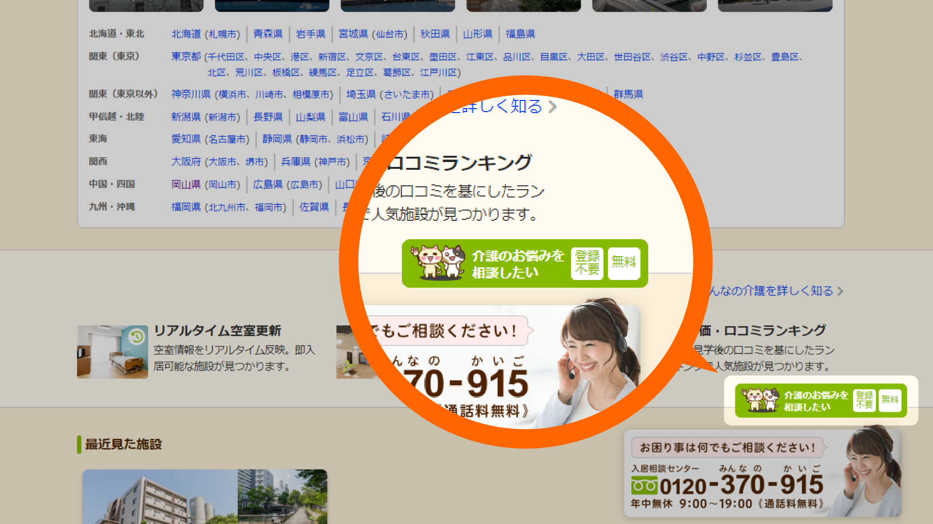 老人ホームの種類については、「みんなの介護サイト」内でもさらに詳しくまとめていますが(https://www.minnanokaigo.com/guide/type/ )、初めて老人ホームを探す方にとっては、何から始めればいいのかわからないもの。施設探しや介護に関する悩みを、気兼ねなく簡単に聞くことができます。
