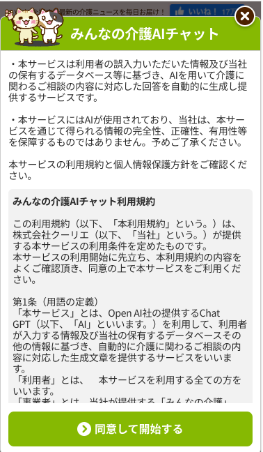 「みんなの介護サイト」トップページの右下に出てくるバナーをクリックし、「みんなの介護AIチャット」の利用規約に同意すると、すぐに利用できます。