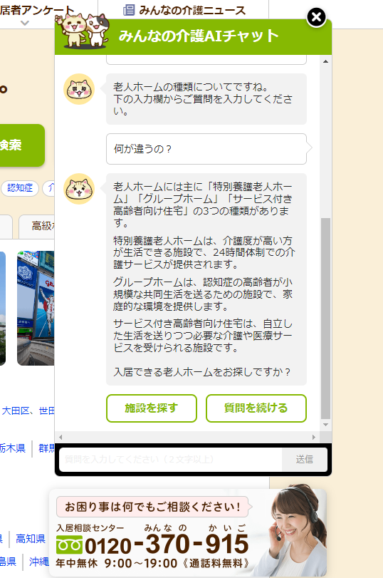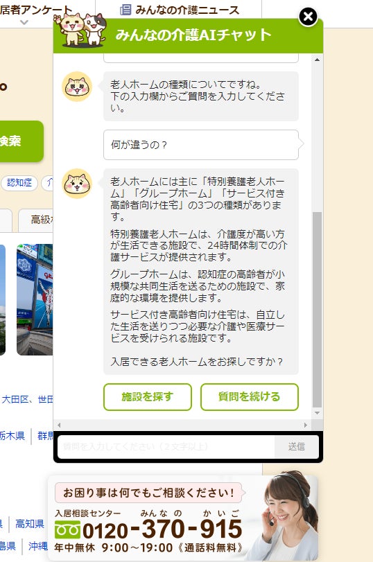 介護施設の入居に関する相談ができるカスタマーセンター(入居相談センター:0120-370-915)は午前9時から午後7時まで開いていますが、今回導入された「みんなの介護AIチャット」は24時間対応しています。老人ホーム探しでじっくり聞きたい場合はカスタマーセンターを、素朴な疑問を気軽に聞きたい場合はチャットボットと、使い分けてみるのもいいかもしれません。利用者の皆さまにはぜひ活用いただき、老人ホーム探しにお役立てください。