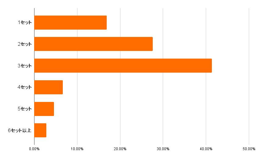 「3セット」と回答した人が最も多く41.32%、続いて「2セット」と回答した人が多く27.61%、「1セット」と回答した人が16.89%となっています。