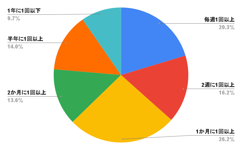 サウナに行く頻度は、「1か月に1回以上」が最も多く26.2%、続いて「毎週1回以上」が20.3%、「2週に1回以上」が16.2%となっており、1か月に1度以上行く人が6割を超えています。