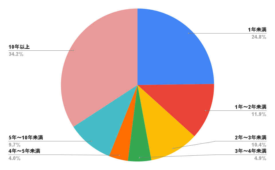 回答のうち、全体の34.2%が「10年以上」と回答し、24.8%が「1年未満」、ついで11.9%が「1〜2年未満」という回答になりました。