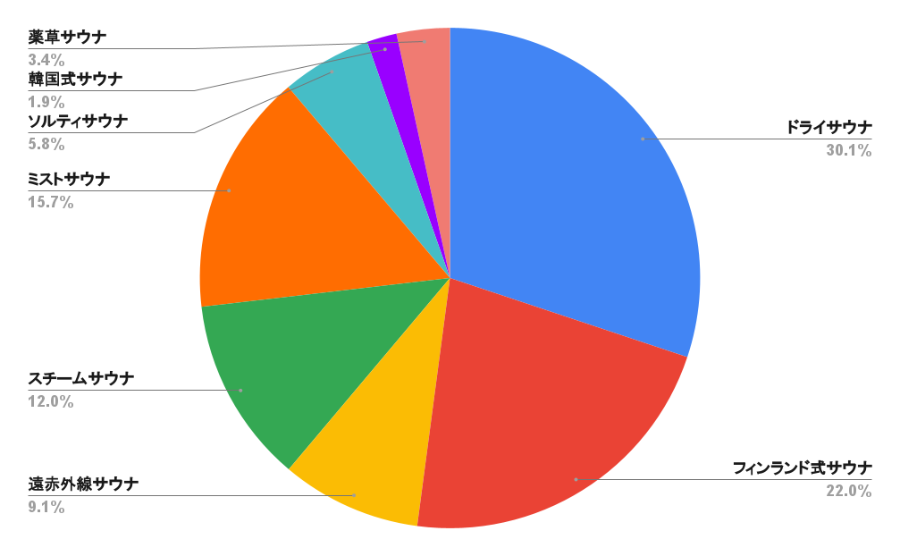 様々な種類があるサウナですが、「ドライサウナ」が好きと回答した人が最も多く30.1%、次に「フィンランド式サウナ」が22.0%、「ミストサウナ」が15.7%、「スチームサウナ」が12.0%、遠赤外線サウナ」が9.1%という結果になりました。「ソルティサウナ」「韓国式サウナ」「薬草サウナ」など、多くの種類のサウナに票が入っています。