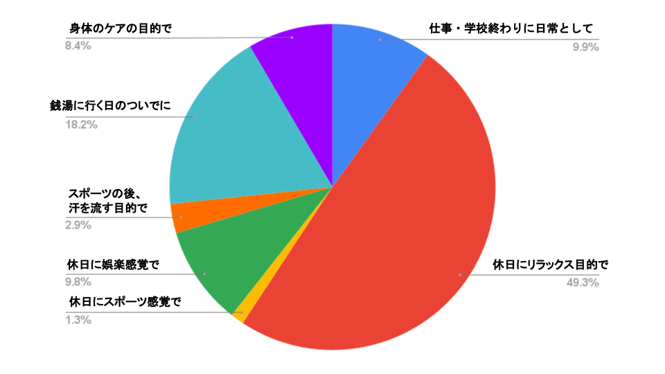 「休日にリラックス目的で」サウナに行くという人が最も多く、49.3%とほぼ半数を占めました。続いて、「銭湯に行く日のついでに」が18.2%、「仕事・学校終わりに日常として」が9.9%と日常的にサウナを楽しむ人も多くいます。「休日に娯楽感覚で」という人が9.8%となっており、休日のお出かけ先としてのサウナも人気を集めています。