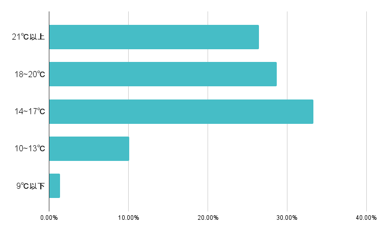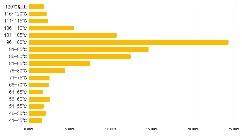 最も回答が多かったのは、「96~100℃」で24.31%でした。続いて、「91~95℃」が14.57%、「86~90℃」が12.37%、「101~105℃」という結果になりました。