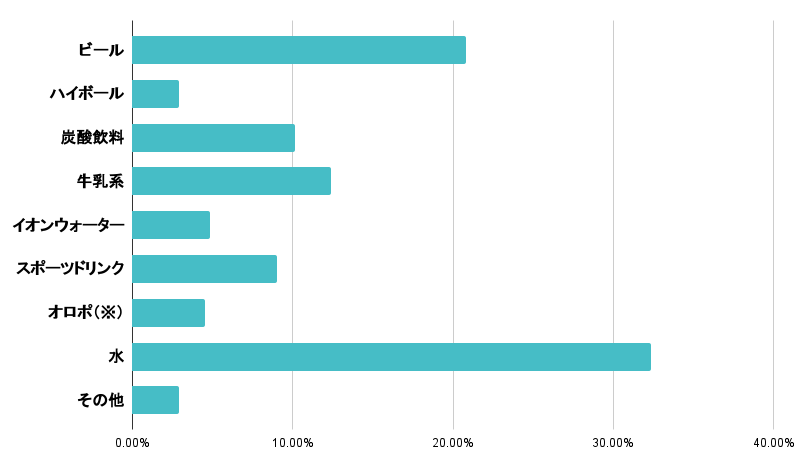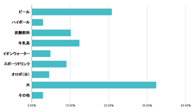 サウナ後の一杯として、一番多かったのは「水」で32.4%、次に「ビール」で20.8%、「牛乳系(コーヒー牛乳、フルーツ牛乳、飲むヨーグルトなど」が12.4%という結果になりました。