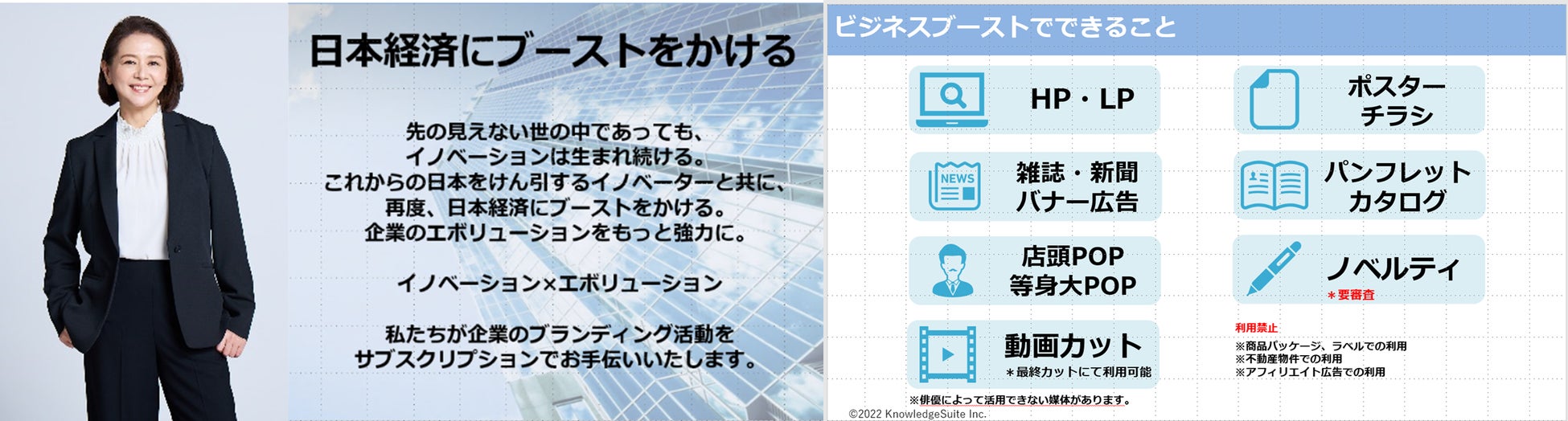 新サービス『ビジネスブースト』のリリースを心よりお祝い申し上げます。これまでは敷居が高く、なかなか手を出しにくかった著名人の起用ですが、本サービスの登場によって、一気に可能性が広がりました。 月額制という料金体系による利用のしやすさは一番の魅力です。 また、写真のバリエーションが多かった為、当社が描いていたイメージ通りに仕上げることができ ました。これからブランディングを強化していく当社にとって、ビジネスブーストは非常に心強いパートナーです。今後も、様々な施策での活用ができそうです。