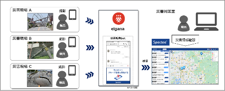 具体的には、「Spectee Pro」の地図上に、「elgana®」で撮影した画像と作成した文章を投稿する仕組みを新たに構築し、合わせて「elgana®」のチャット機能を用いて、クローズドな環境で情報を共有できる機能を提供します。