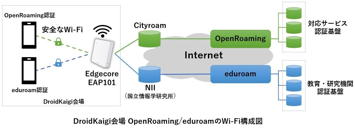 教育・研究向け無線LANローミングシステムのeduroamや、世界各地の通信事業者・都市などが参加するWBA OpenRoamingなど、様々なローミングフェデレーションと相互接続されており、DroidKaigi2023でのOpenRoamingもCityroamの国内認証ハブと介して接続を実現しています。