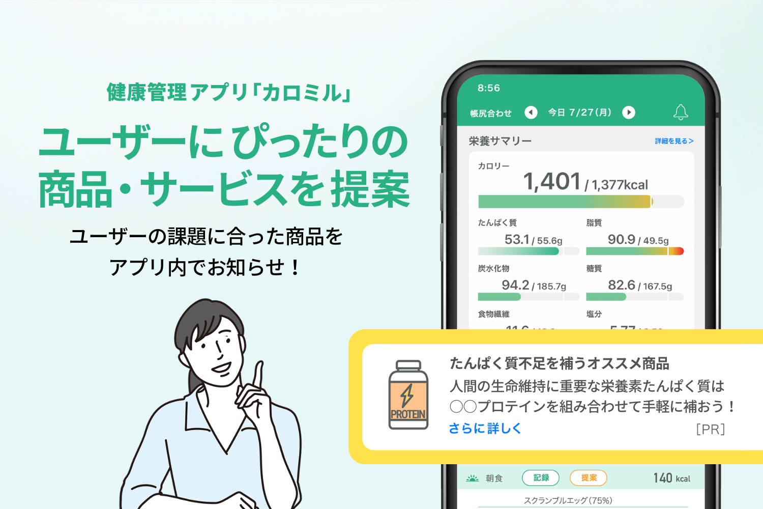 カロミルで健康管理をしているユーザーは、「ダイエットに取り組みたい」「健康を維持したい」「栄養バランスを整えたい」など、食事内容や体質の改善志望を持ちつつも、どのように行動してよいかわからないユーザーが多くいます。今回このようなユーザーの声に応えるべく、ユーザーの課題に合った親和性の高い商品をカロミルアプリ上で提案するサービスをスタートしました。