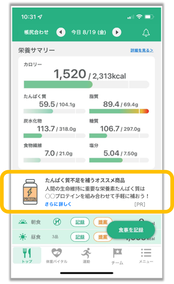 今後カロミルでは、ユーザーが記録した属性(性別、年代等)、喫食(食事内容、栄養素等)、運動(エネルギー消費量、歩数等)、バイタル(体重、体脂肪率、BMI等)などの様々な要素の膨大なデータを組み合わせることで、パーソナライズされた商品やサービスをアプリトップ画面にバナー形式などで掲載し、個々のカロミルユーザーが抱える課題に対するソリューションを提供します。