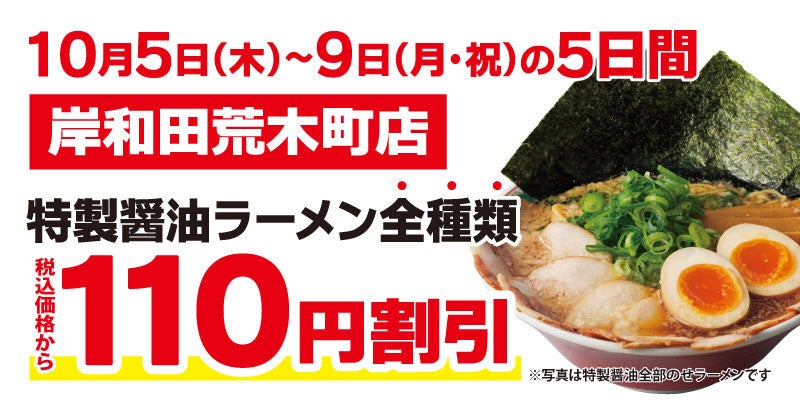 この度オープンを記念して、「岸和田荒木町店」にご来店いただいたお客様には、『特製醤油ラーメン全種類』を税込価格から110円割引で販売いたします。