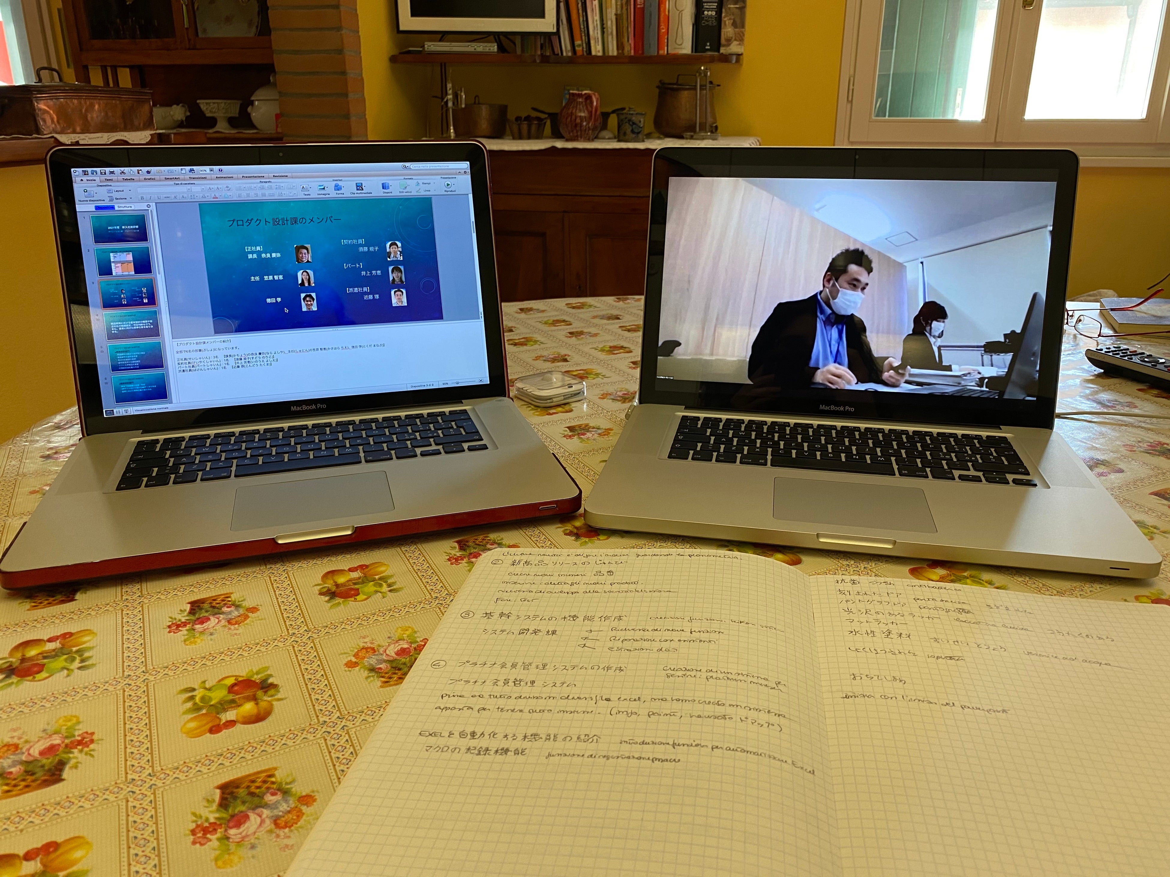 2021年3月に日本での生活のための準備が整ったのですが、コロナ対策の入国制限により来日できなくなってしまいました。しかたなくイタリアでテレワークを開始し、Zoom会議や録画した研修動画で2カ月間の新入社員研修を行いました。ところが6月を過ぎても一向に入国制限は解除されず、そのままテレワークを継続せざるをえませんでした。