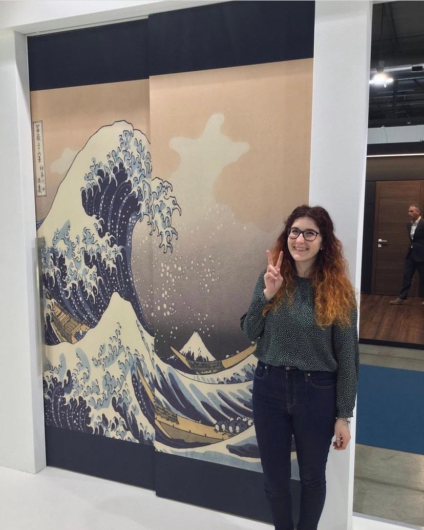 当社は2019年3月にイタリア・ミラノで開催された建材見本市『MADE EXPO2019』に日本の室内ドアメーカーとして初出展。その際に来場客として来ていた地元の経営者から日本語が堪能な女子大生を紹介され、ボランティアで通訳をしてくれたのがフランチェスカ・バルドゥッツィーです。当時彼女は日本での就職を希望しており、海外進出を視野に入れている当社にとっても、イタリア語が堪能な社員は必要な人材でした。この展示会での出会いがきっかけとなり、大学卒業後当社に入社しました。
