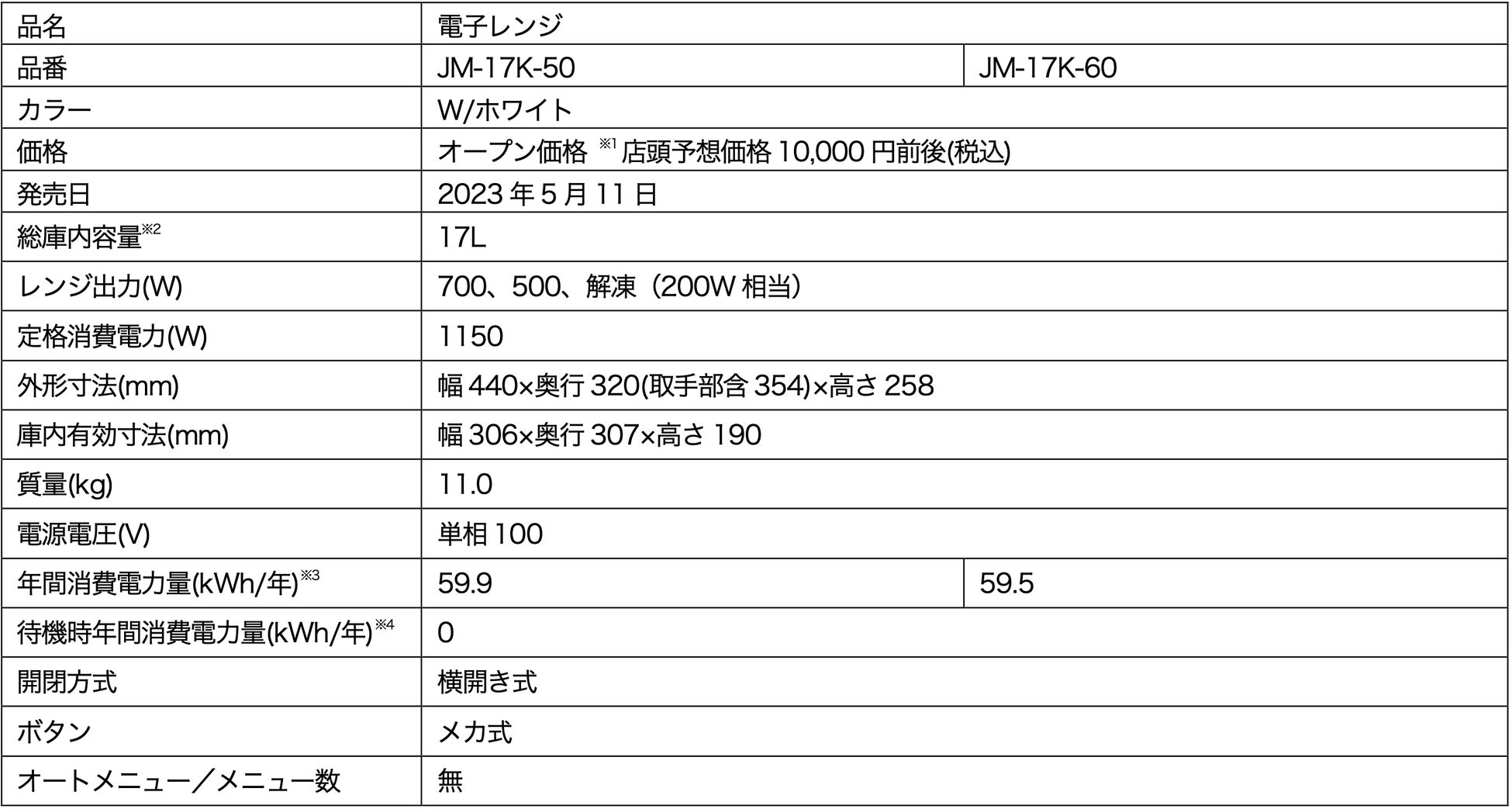 する17L電子レンジ(JM-17K-50、JM-17K-60)を2023年5月11日より、全国の家電量販店、ホームセンター、GMS、WEB通販などで順次発売いたします。