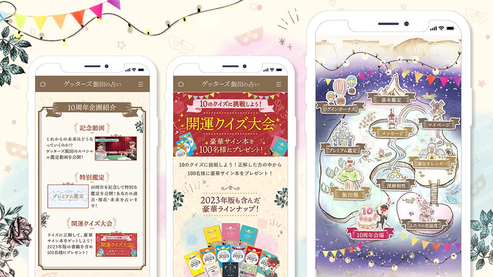 「ゲッターズ飯田の占い」は、2012年よりサービス提供を開始し、2022年9月18日(日)をもちまして10周年を迎えることになります。10周年記念キャンペーンでは日頃の感謝を込めた特設ページをオープンし、10周年記念動画やキャンペーン限定の特別鑑定、さらに抽選でプレゼントが当たるクイズコーナーなどもご用意しております。また、サイト全体も普段とは一味違ったデザインで装飾されておりますので、是非この機会にご利用ください。