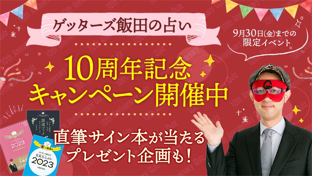 開運クイズ大会を開催。前後半で各5問のクイズに正解するとゲッターズ飯田さんの直筆サイン本が当たるチャンスも!参加方法の詳細はサイトをご覧ください。