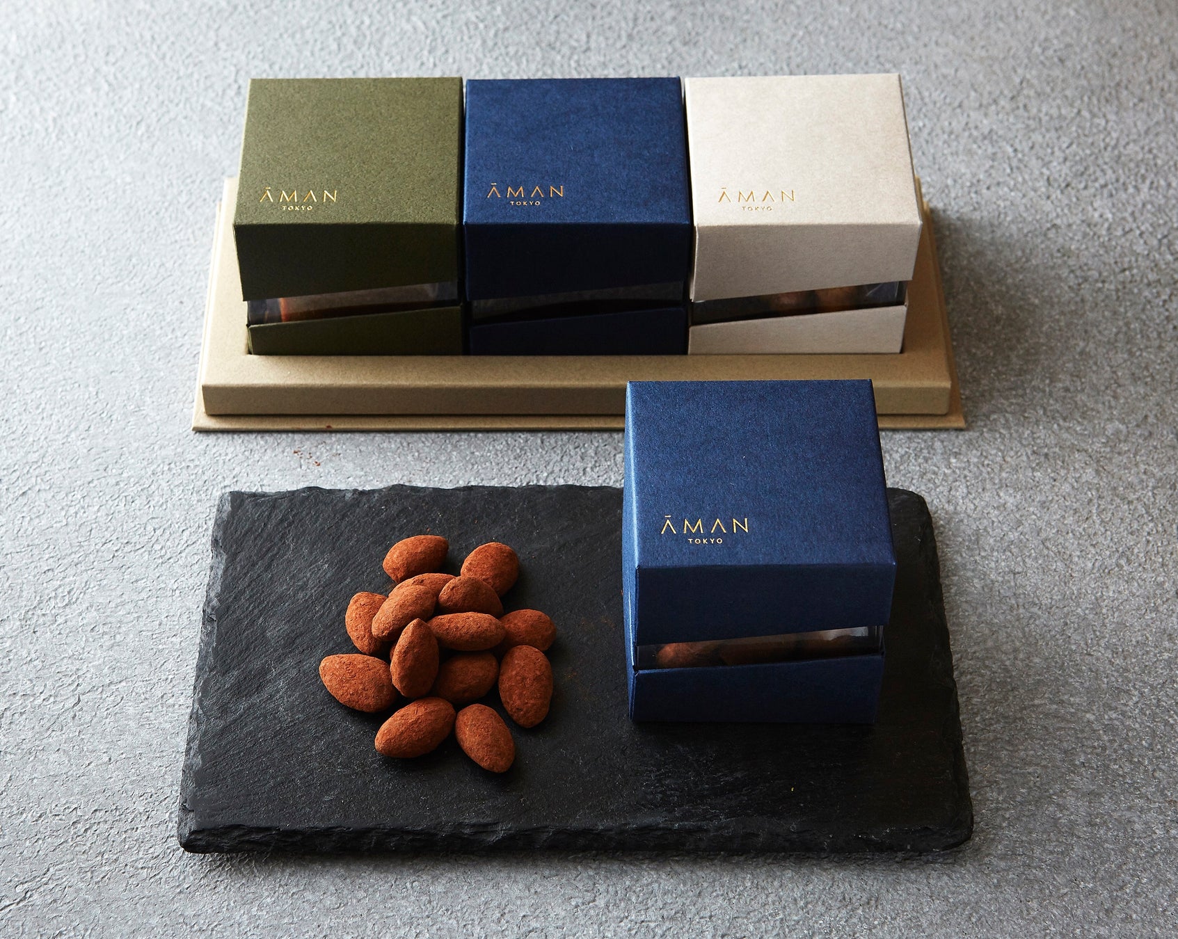バターの香り豊かなパウンドケーキや、しっとり香ばしい焼き菓子など、素材にこだわったお菓子を小さな箱に収めた、アマン東京のギフトアイテム「KOBAKO」より、父の日ギフトとして期間限定で、青藍色(せいらんいろ)の小箱に入ったアーモンドチョコレートをご用意しました。カリっと香ばしくローストしたアーモンドに、程よい甘さのチョコレートをコーティングし、ほろ苦いココアパウダーで仕上げられています。お酒とのペアリングとしてもお楽しみいただけ、甘いものが苦手な男性の方にもお召し上がりいただける一品です。四角い小箱を自在に組み合わせてご自身でデザインできる「KOBAKO」から、他にもお父さまのお好みに合ったお菓子を選んで、組み合わせてみてはいかがでしょうか。