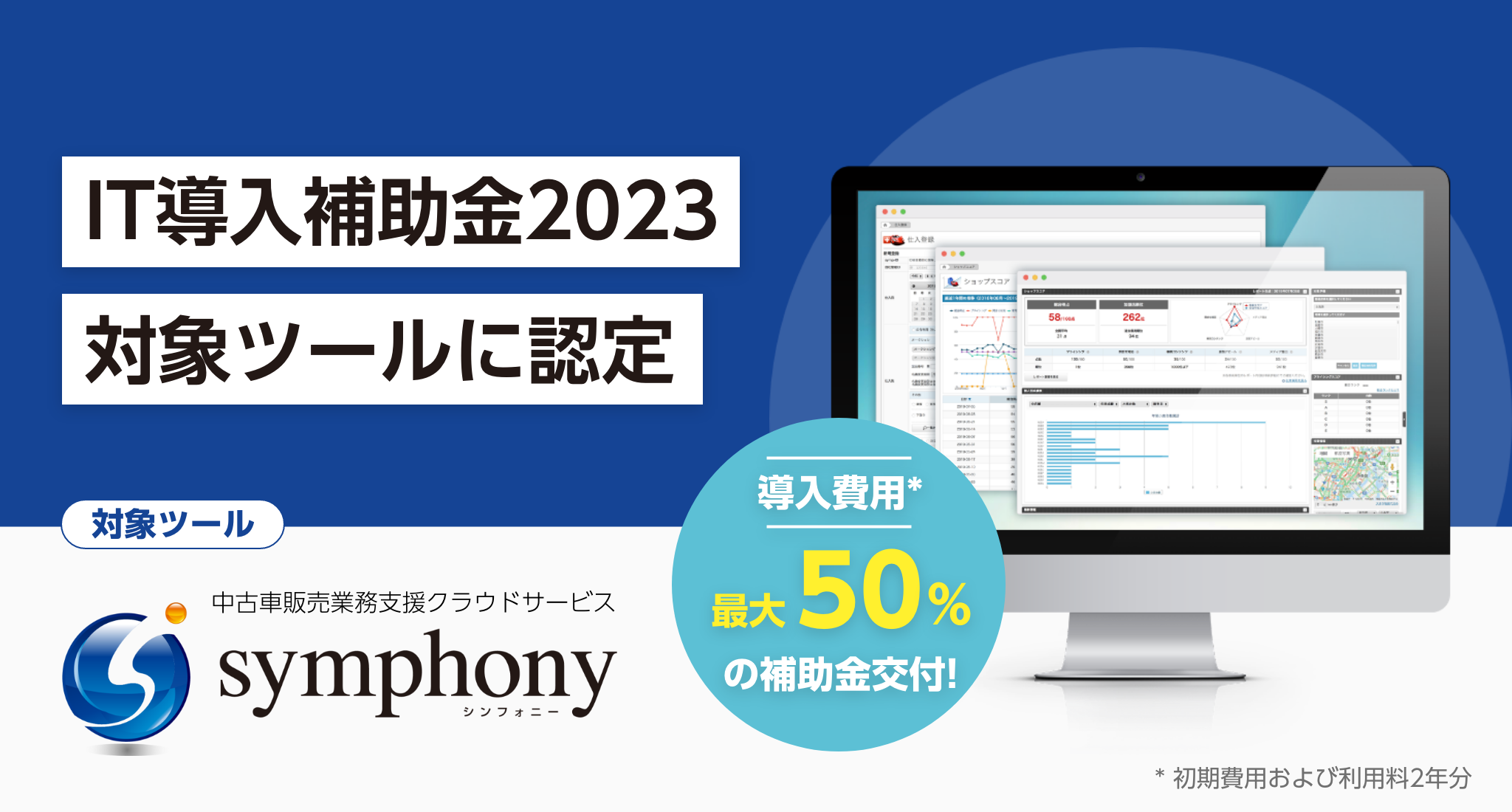 これにより、IT導入補助金2023において補助対象となる中古車販売店様が「symphony」を導入いただく際に、導入費用(初期費用および利用料2年分)について、最大50%の補助金を申請することが可能となります。