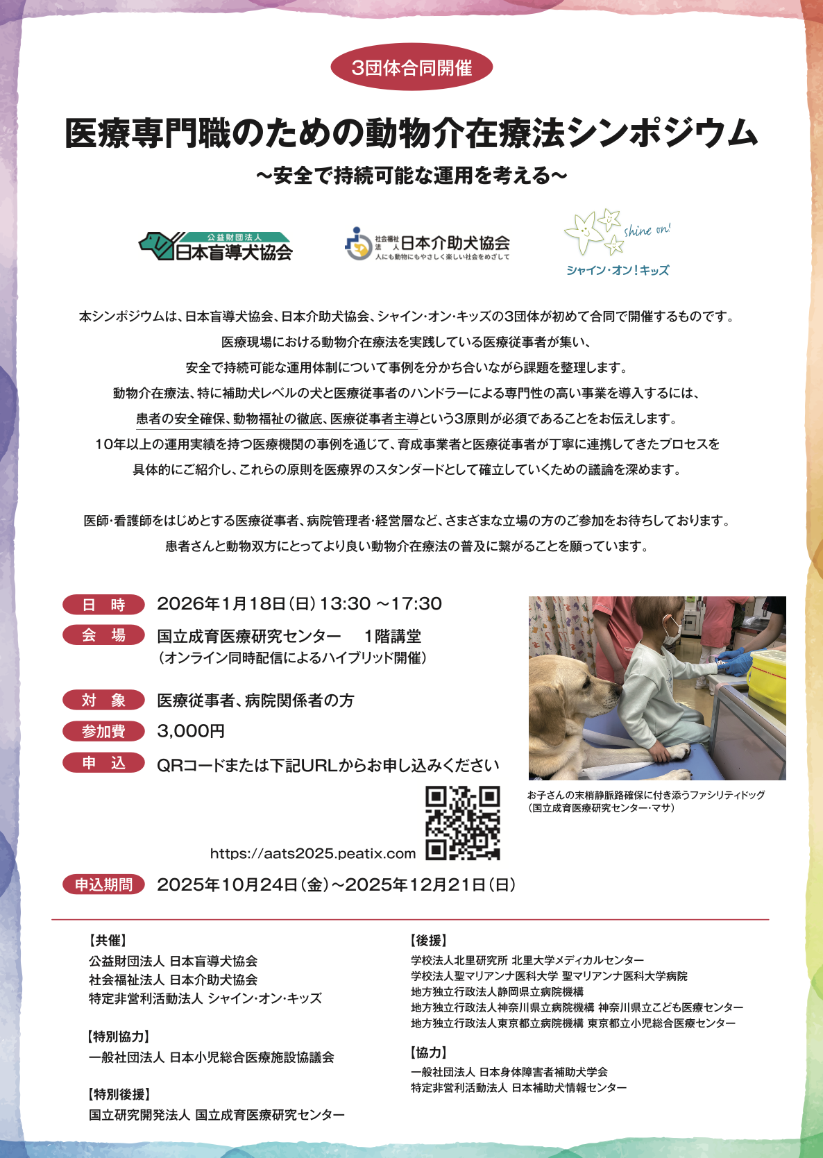 日本盲導犬協会、日本介助犬協会、シャイン・オン・キッズの3団体による初の合同企画「医療専門職のための動物介在療法に関するシンポジウム」において、各団体が育成する犬によるデモンストレーションを実施します。盲導犬、介助犬、ファシリティドッグそれぞれの役割や実際の活動を、実演を通してご覧いただける機会となります。