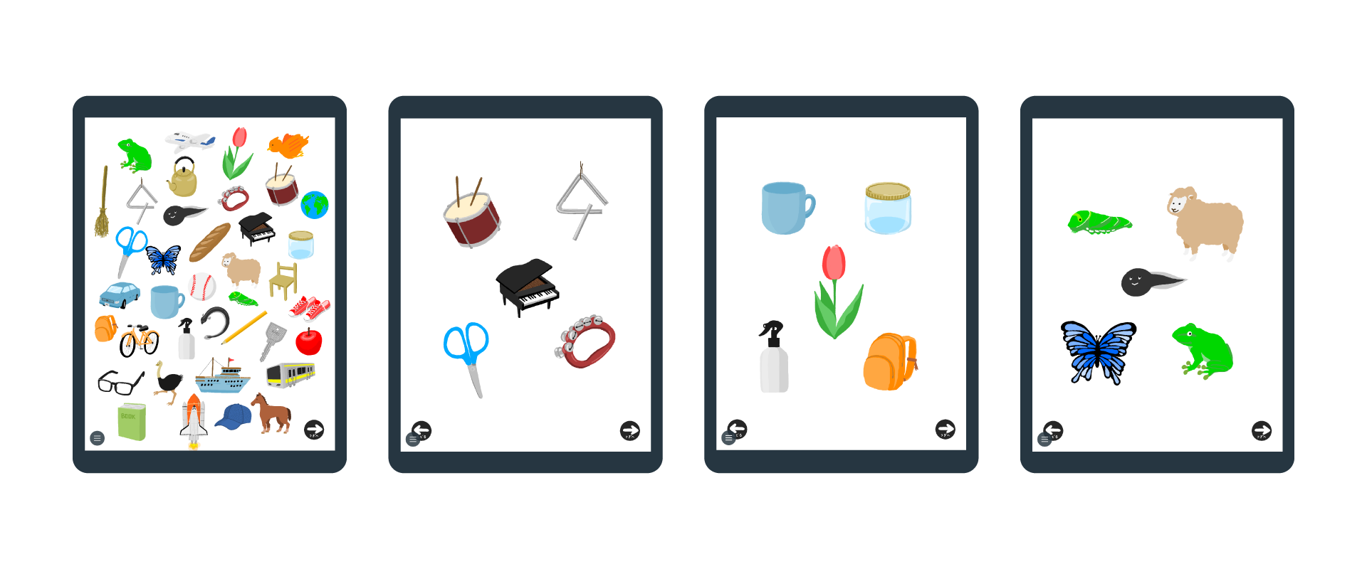 | 数学の本質は、計算すること以上に、自由で多様な「モノの見方」を見つけるところにあります。 画面にならぶ一見とりとめのない絵の組み合わせの中にある「似ているところ」「似ていないところ」の視点を見出す作業は、数学の本質を体験することに繋がります。なかまはずれの発想も答えはたくさん!発想を広げて、自分で描いた絵を加えるなどして、自分なりのこたえ(考え方、視点)を発見する喜びを体験してほしいです。 |
