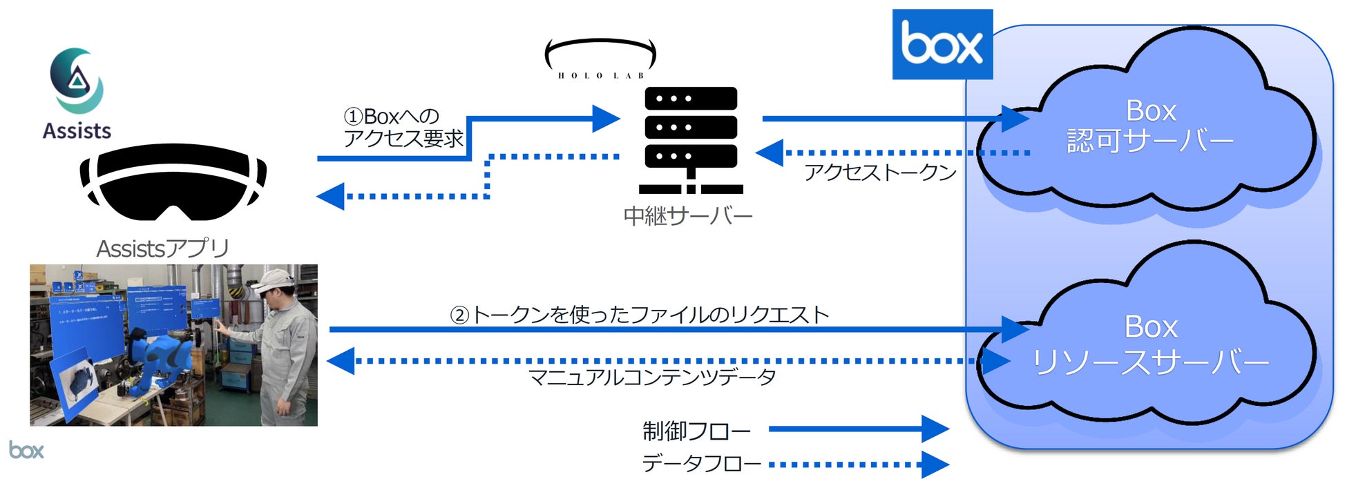 従来はHMD内にコンテンツを保存して運用するケースが多く、機密性の高いマニュアルでは配布・更新・権限管理の負荷が課題でした。Boxのアクセス制御やログ管理とAssistsを組み合わせることで、これらの課題を軽減できます。