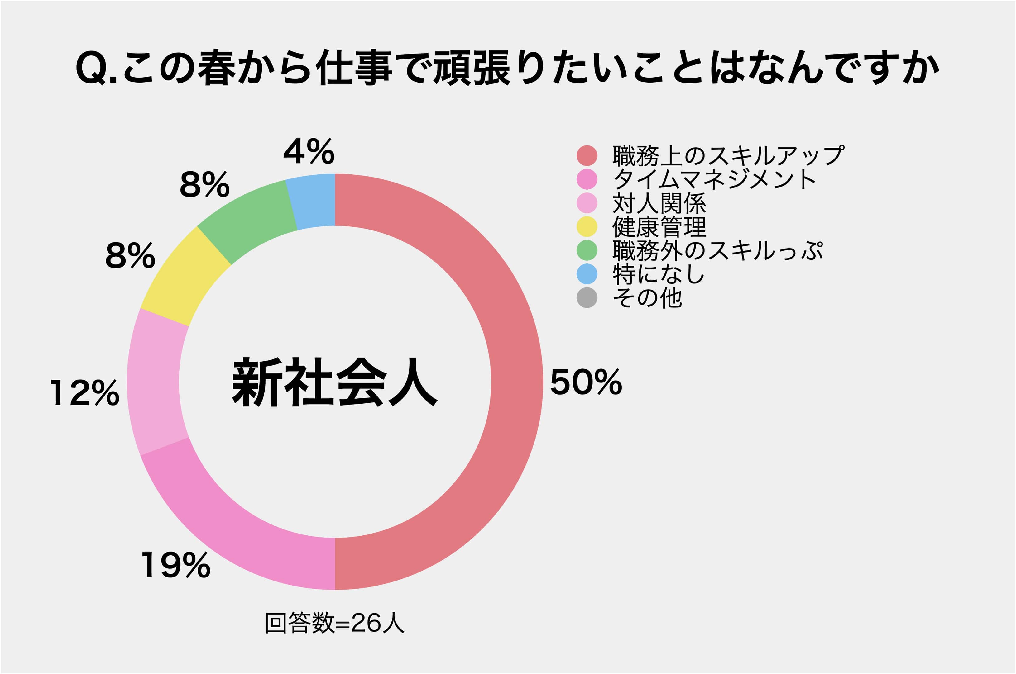 新社会人がこの春から仕事で頑張りたいこと1位は「職務上のスキルアップ」で半数が選択し、2位の「タイムマネジメント」19%から大きく差をつけました。