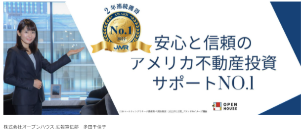 株式会社オープンハウスグループ(本社 東京都千代田区、代表取締役社長 荒井正昭、以下「当社」)のグループ子会社である株式会社オープンハウスにてアメリカ不動産事業を行うウェルス・マネジメント事業部が、「アメリカ不動産年間取引数・取扱高No.1」「安心と信頼のアメリカ不動産投資サポートNo.1」を獲得いたしました。